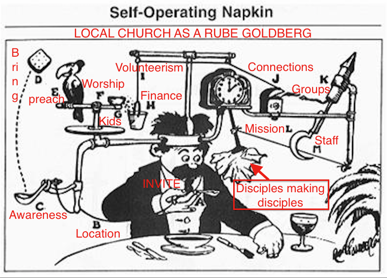 As it turns out, the local church is an extremely and breathtakingly complex animal. Her mandate to seek and save the lost, and furthermore, to make disciples of them may be simple on paper, but not so in real time. The local church could easily be likened to that of a RUBE GOLDBERG MACHINE.